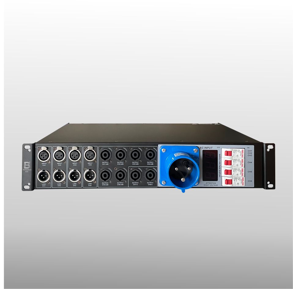具有6路32A/4000W供电输出,4路卡浓输入,4路卡浓输出,8个音箱欧姆插座。流动及固定安装的必备工具